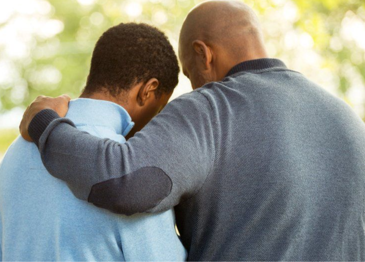 A daddy walks beside his children and holds their hand, brushes away tears, and kisses foreheads.
